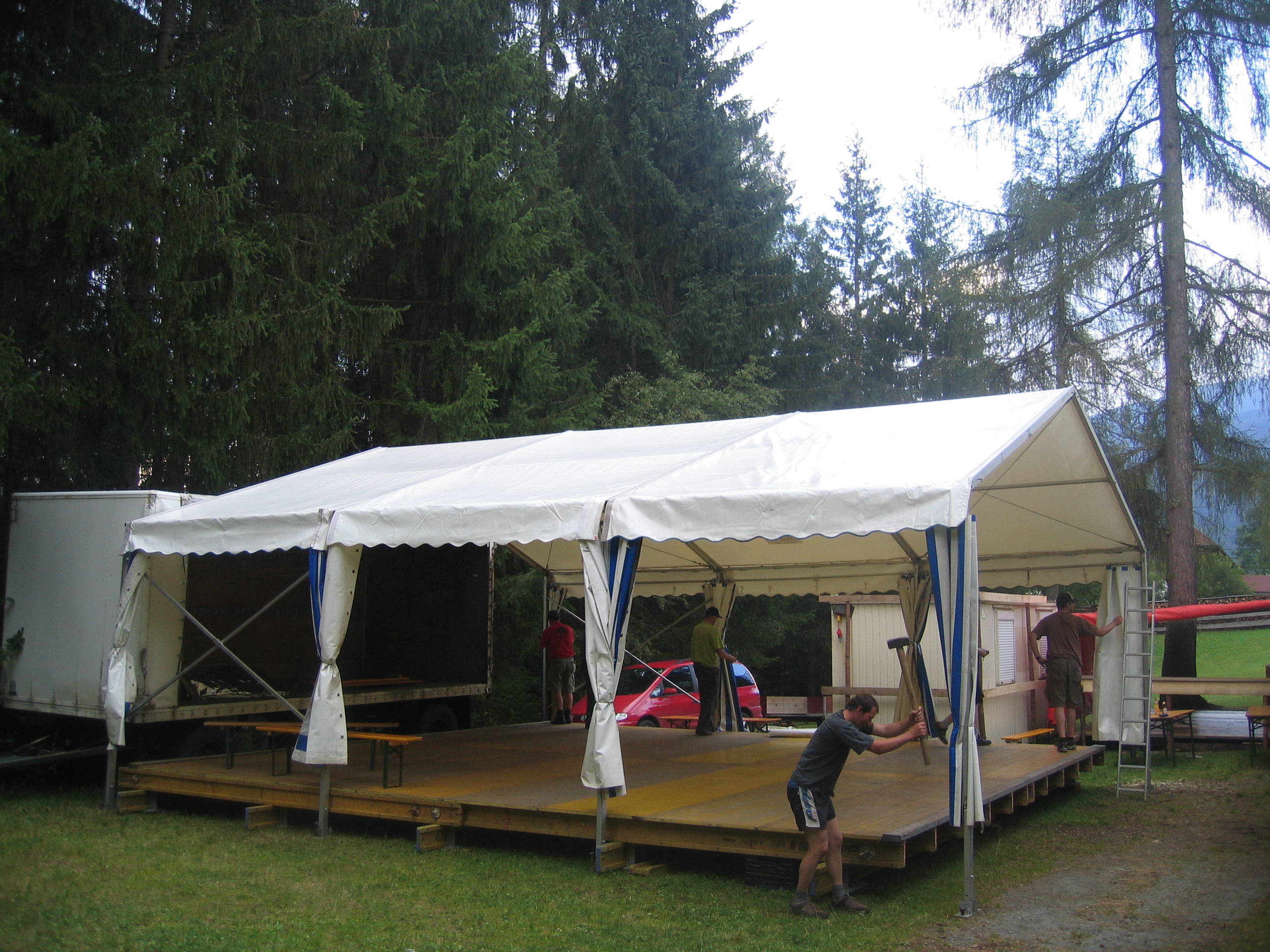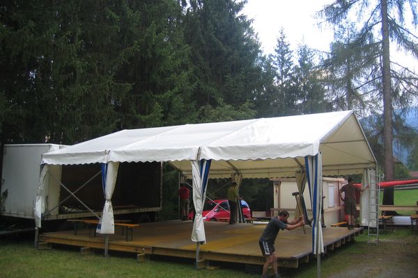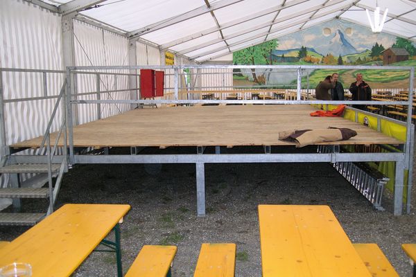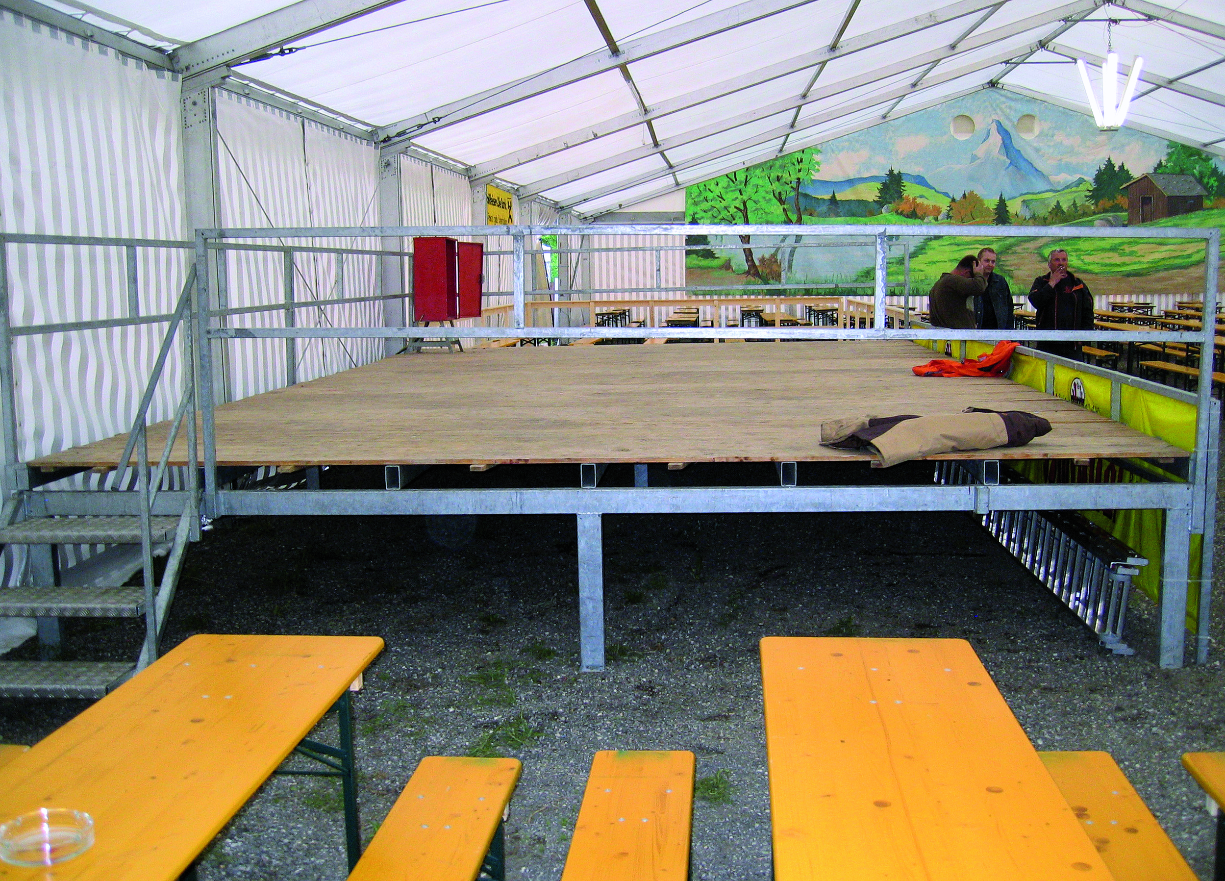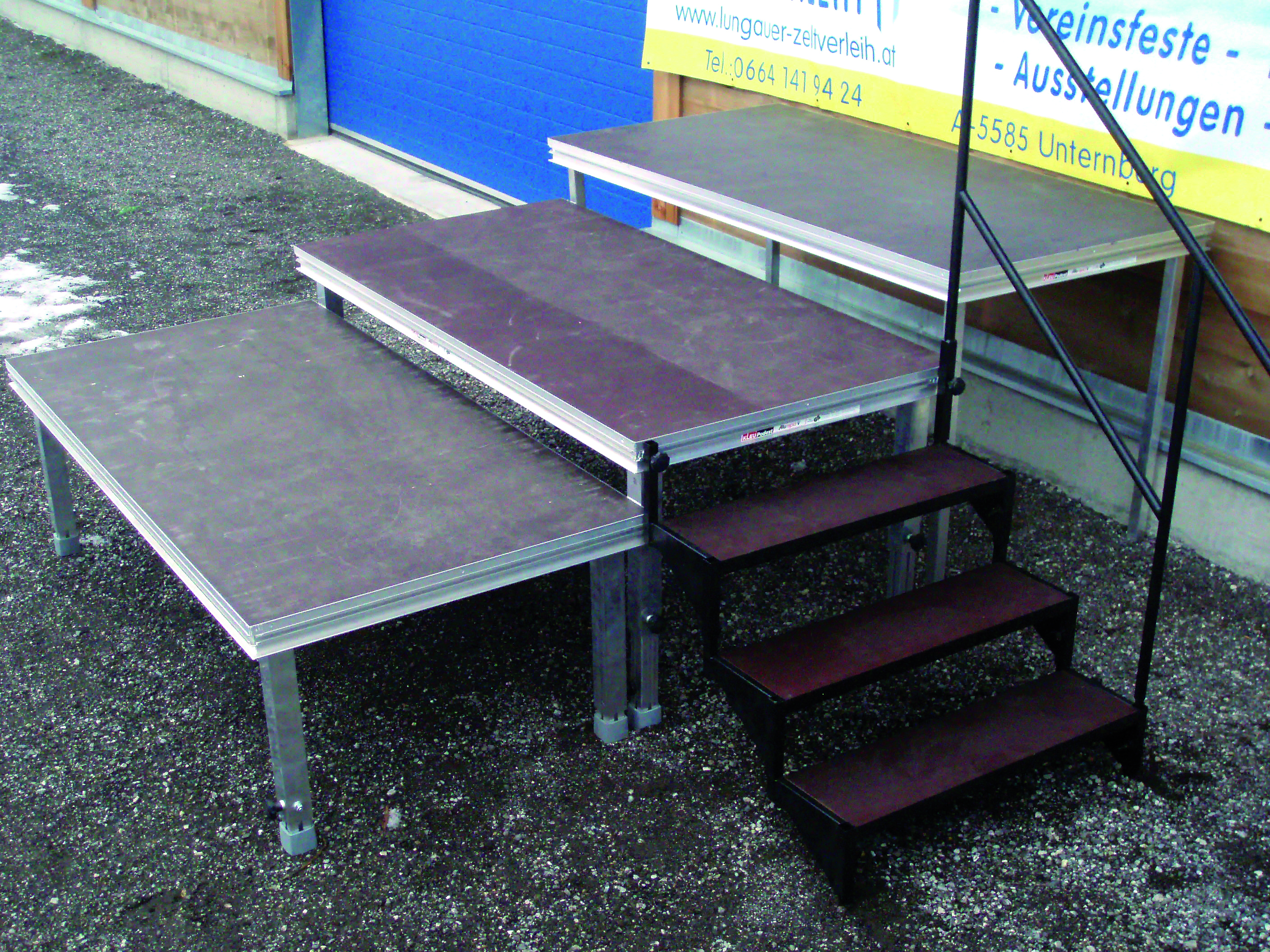 Stabile Ausführung auch für Tanzverstaltungen geeignet. Die einzelnen Panele haben ein Breite von 0,5 m und eine Länge von 5 m oder auch mit einer Breite von 1 m und einer Länge von 4 m. Die Verbindung wird durch eine Einschubschiene problemlos hergestellt.